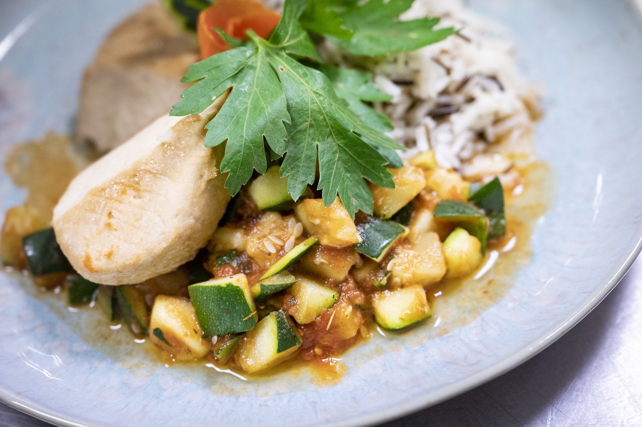 Gemeinsam mit dem Food-Start-up THE GREEN MOUNTAIN bietet Aramark seit März vegane Gerichte wie Burger mit Trüffelmayonnaise und Kräuterseitlingen oder Ravioli mit Kokoscreme, Kichererbsen, Spinat und Yellow Lentil Balls an. Auch Klassiker wie Schnitzel mit Pommes frites stehen vegan auf der Speisekarte. Für den Hunger zwischendurch gibt es eine Auswahl an pflanzenbasierten Kuchen und Desserts, außerdem sorgen verschiedene Salatbowls für ausreichend Nährstoffe. Darüber hinaus sind die angebotenen Getränke wie Softdrinks und Kaffeespezialitäten vollumfänglich vegan. „In unserem Messerestaurant bieten wir vielfältige Gerichte und Snacks, die sich gut für den Messe-Alltag und eine hochwertige Versorgung unserer Gäste eignen“, erklärt Seng.